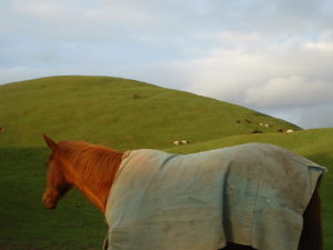 Part of it is the way the near (horse) and far (sheep) are juxtaposed so closely on the same plane, making the sheep appear so minuscule. Then, the soft clouds in the pale blue sky, the roundness of the hills and of the horse’s back, the deep green of the grass and the ruddy brown richness on the horse’s neck, and the subtle but rich colors of the horse’s blanket—all combine to give such visual pleasure.